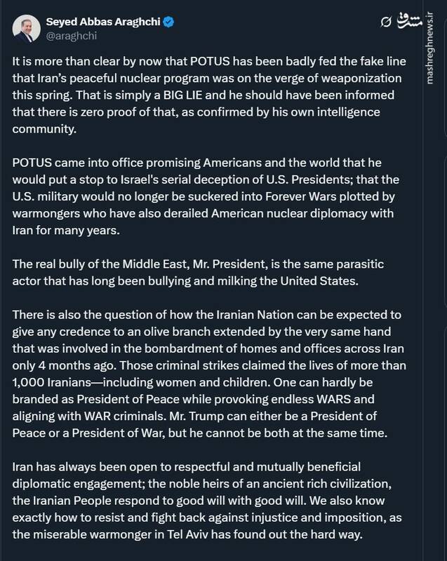 عراقچی وزیر امور خارجه کشورمان در واکنش به اظهارات رئیس جمهور امریکا در شرم الشیخ در توئیتر نوشت: