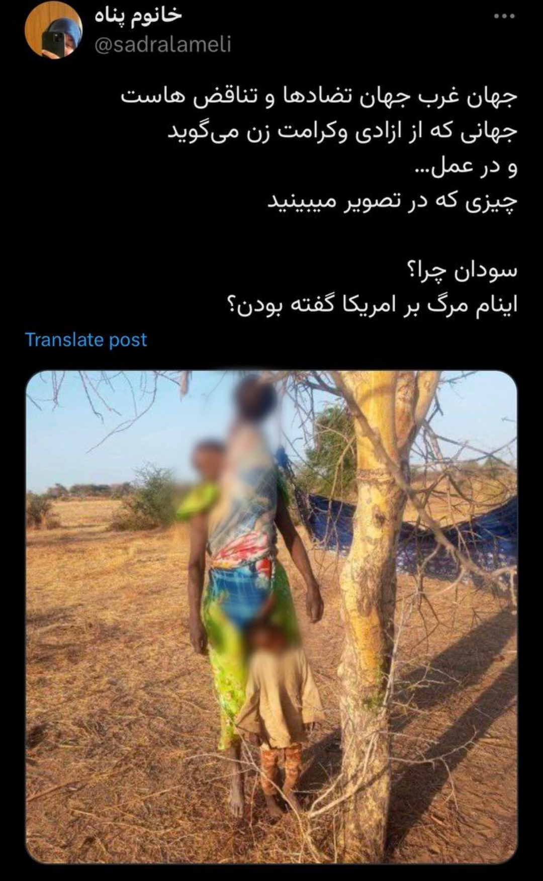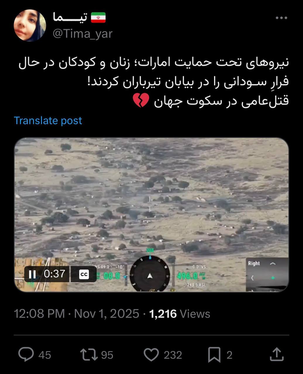 حساب کاربری «تیما» در شبکه ایکس، با توجه به نقش امارات در قتلعام گسترده زنان و کودکان در حال فرار سودانی نوشت: